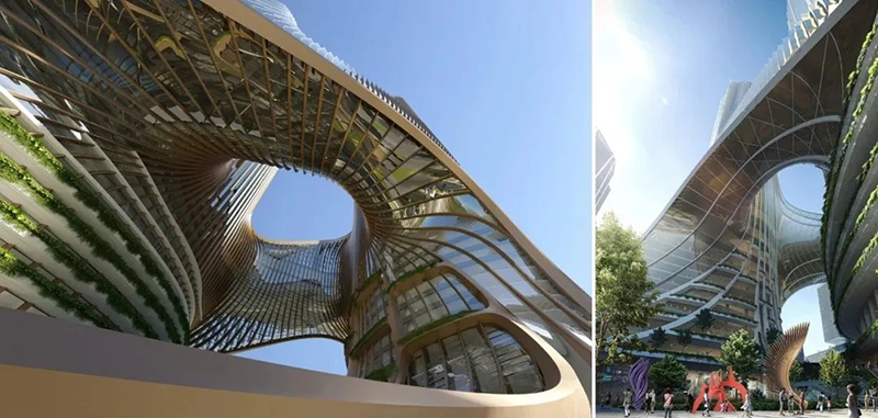 C塔被稱為“未來之塔”,位于深圳市南山區(qū)深圳灣超級總部基地的“十字雙軸”中心,總投資約165億元,占地面積3.6萬平方米,由高約395米和300米的兩座摩天樓共同組成的一座多維度“垂直都市”,呈“雙人起舞”的形體。