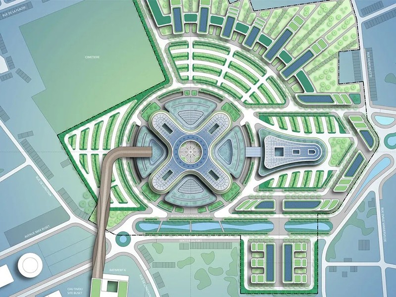 醫(yī)療后勤基地滿足了拉盧維耶爾基地和其他網(wǎng)絡地點的后勤需求。它位于東區(qū)烏爾班大道北側(cè)的環(huán)島上,提供直接的道路交通,并通過玻璃天橋與龍?zhí)贯t(yī)院相連。園區(qū)在總體規(guī)劃中整合了代際住房、養(yǎng)老院和娛樂設施等互補功能,促進了城市的多樣性和一體化。