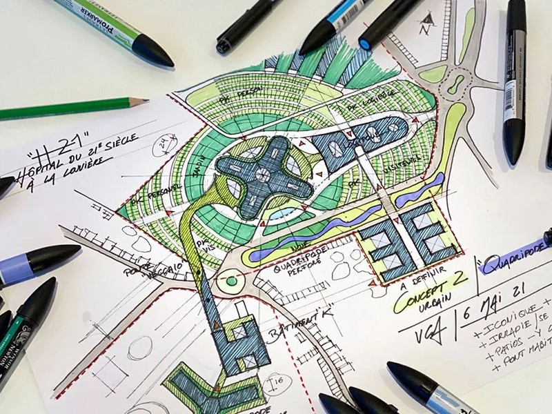 HOSPIWOOD 的目標是打造一個真正的生態(tài)社區(qū),讓居民在這里享受生活、工作和就醫(yī)的樂趣。該項目注重資源和流量的高效、平衡管理,在保護環(huán)境的同時最大限度地利用場地資產(chǎn)。該項目融合了生態(tài)和團結(jié)過渡的元素,如城市綠化、可再生能源利用和可持續(xù)交通??傮w規(guī)劃采用放射狀同心布局,將人流引向中央中庭,將其作為城市公共樞紐。建筑與景觀和諧地融為一體,融入了風力渦輪機和重新利用的礦渣等特色元素。保護景觀包括將龍?zhí)兜貕K改造成郁郁蔥蔥的城市森林,以防止土壤人工化。這包括種植當?shù)靥赜械臉淠荆龠M本地生物多樣性,以及實施雨水收集系統(tǒng)。新東部城市大道沿線綠樹成蔭的山谷是一個顯著特點,它是一個雨水過濾池,為居民提供了一個寧靜的環(huán)境。這種綜合方法尊重了該地區(qū)的工業(yè)、文化和自然遺產(chǎn),豐富了社區(qū)的特征。