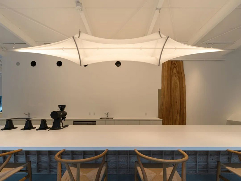 在這層帷幕之下,一個明亮的白色立方體空間映入眼簾。拋光石膏制成的柜臺仿佛懸浮于中央,其細膩的飾面與彈力織物燈具的柔和半透明質感形成鮮明對比。光線與材質的精妙平衡,營造出一種近乎失重的空靈氛圍,進一步強化了咖啡館的縹緲理念。