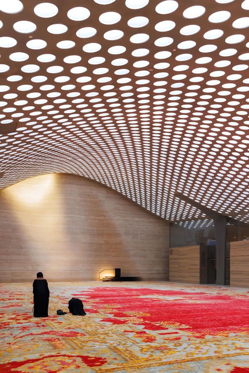 項目的核心為空間是一個面積875平方米的祈禱大廳,略微偏離建筑網格17度,準確朝向麥加。廳內鋪設有由新西蘭羊毛制成的大型手工簇絨地毯,其圖案以集體尺度重釋了傳統伊斯蘭幾何紋樣。天花布置了5,500個錐形天窗,將自然光引入室內,營造出神圣靜謐的光環境。