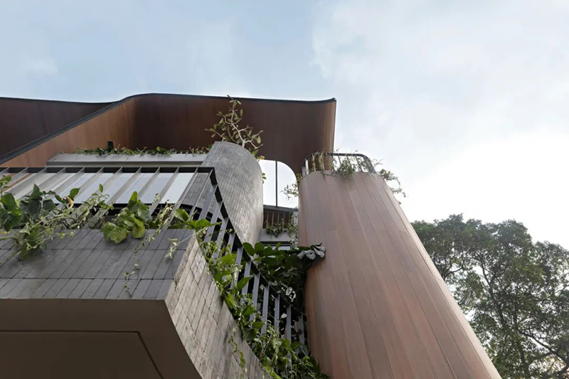 項(xiàng)目打破傳統(tǒng)庭院的平面布局,巧妙地將東南亞住宅常見的“家庭后院”概念垂直延伸至屋頂,使大自然得以在更高處生長,生活也隨之向上拓展。