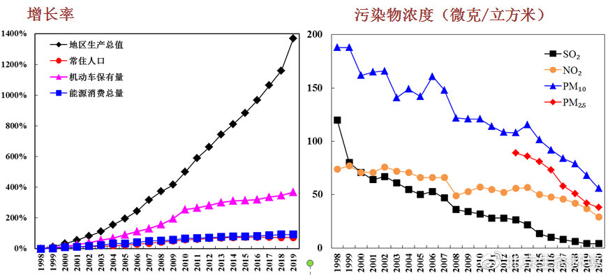 (圖10 1998年以來(lái)北京市地區(qū)生產(chǎn)總值、常住人口、機(jī)動(dòng)車保有量、能源消耗總量增速與各項(xiàng)污染物濃度變化趨勢(shì))